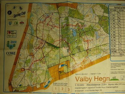 Vyrazili jsme v pátek ve tři (jako ráno), naštěstí ale cesta nebyla zas tak hrozná - navíc jsme ji trochu okořenili nechtěným výlet do Kodaně, když nám policisté uzavřeli odbočku. Naštěstí jsem měl s sebou GPS, takže jsme se odtamtud docela rychle vymotali. Večer pak byl noční sprint. Bohužel letos pořadatelé zařadili i noční štafety, takže pro závod jednotlivců nebylo dost lidí, aby se normálně vypsaly běžné kategorie. Tím pádem pro mě noční trochu ztratily své kouzlo - zatím vždy jsem tam dobře zaběhl, tak bych se na "normální" konkurenci dost těšil.
